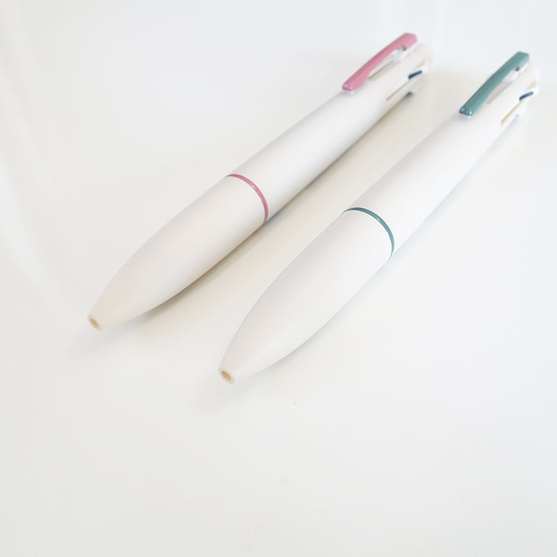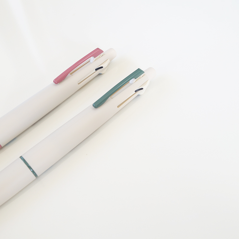 マットなサンドベージュに寄り添うペンクリップのカラーと同系色のボディの帯が、手元にそっと温かさを添えてくれて、見ているだけでほっと安心する気持ちに。