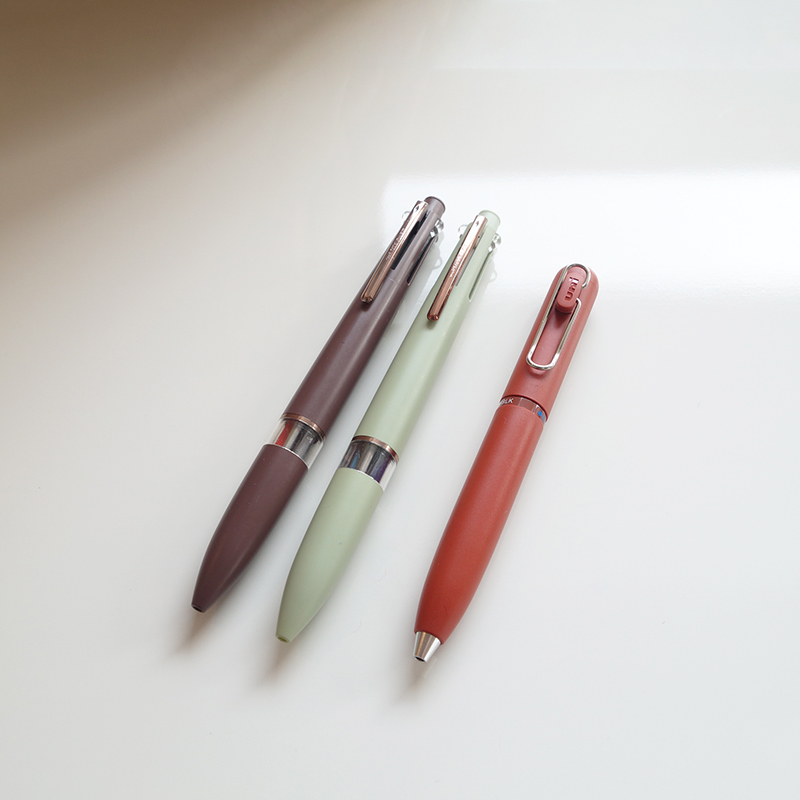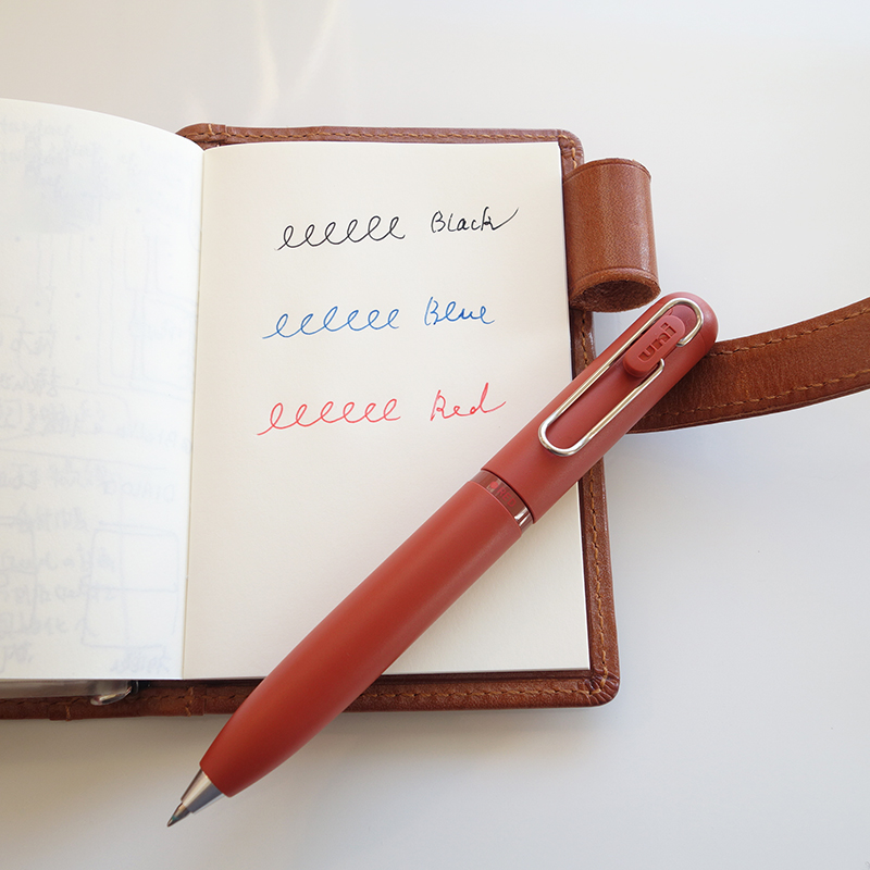 少しだけ頭がちょこんと見え隠れしますが、3色ボールペンで書き心地も良く、しかも短めのペンということでお迎えしました。