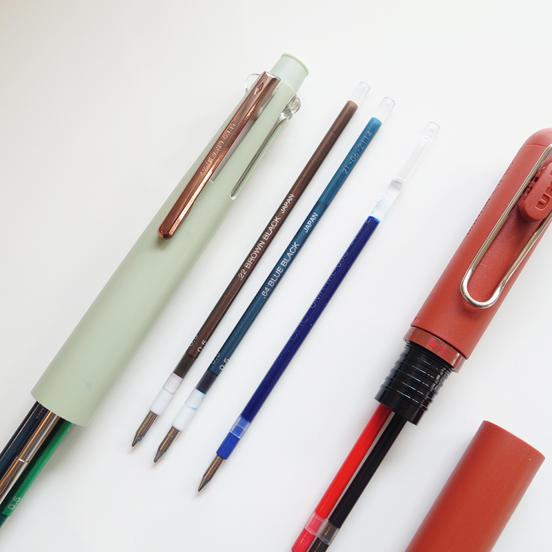 私は、手帳に文字を書くとき、万年筆でもボールペンでも茶系のインクを好んで使っています。そこで、手持ちの「Style+Fit」のブラウン・ブラックのリフィルをREDの部分に装着し、BLUEの部分にはブルー・ブラックのリフィルを差し込みました。