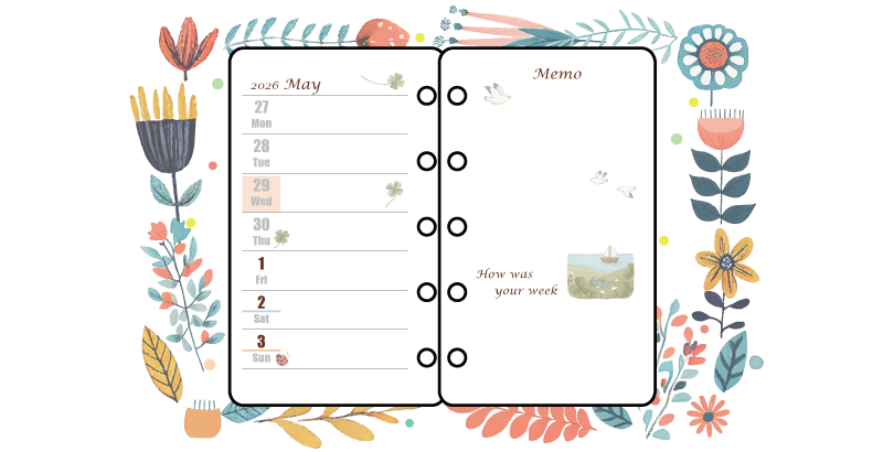今月のウィークリーログは、クローバーとテントウムシ、やさしい空気をイメージしてデザインしました。シンプルなレイアウトの中に、のびやかで落ち着いた時間の流れを感じられるように仕上げています。
